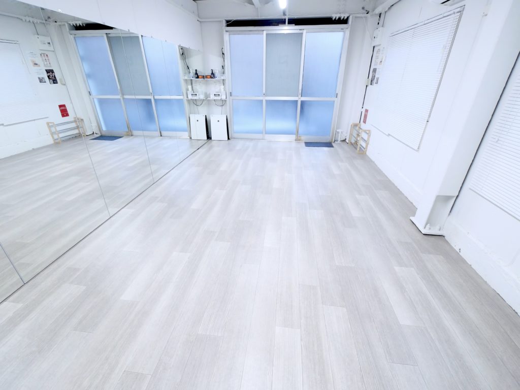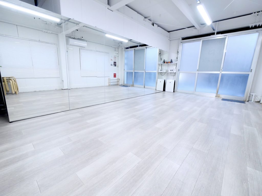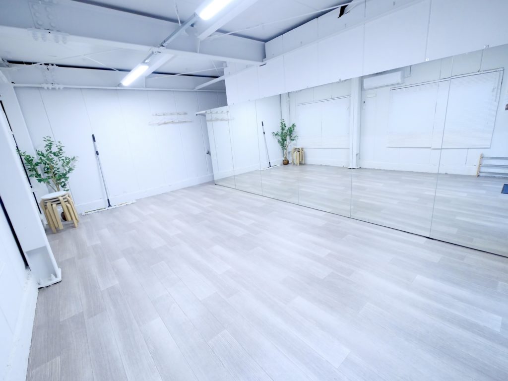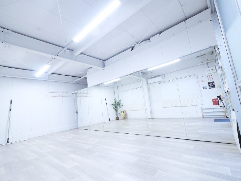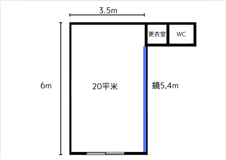20平米、横6m分鏡が一面に設置されている長方形のスタジオ。