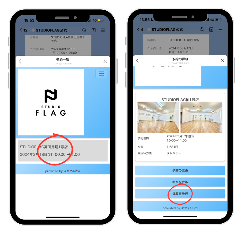 ②【発行したい予約】を選択、【領収書発行】を選択し完了。登録メールアドレス宛に発行URLが送信されておりダウンロードができます。