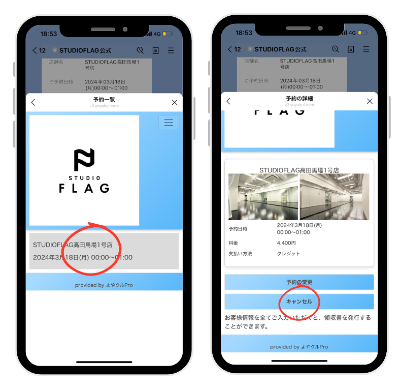 ①【ご予約】を選択、【右上の3本線】を選択、【キャンセル】を選択