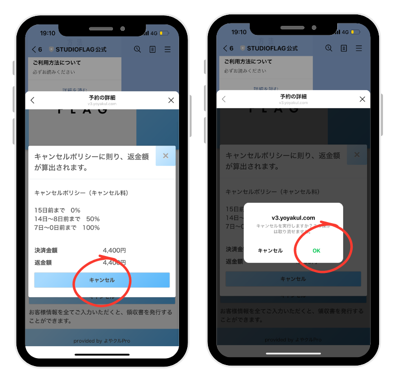 ②【キャンセルしたい予約】を選択、【キャンセル】を選択