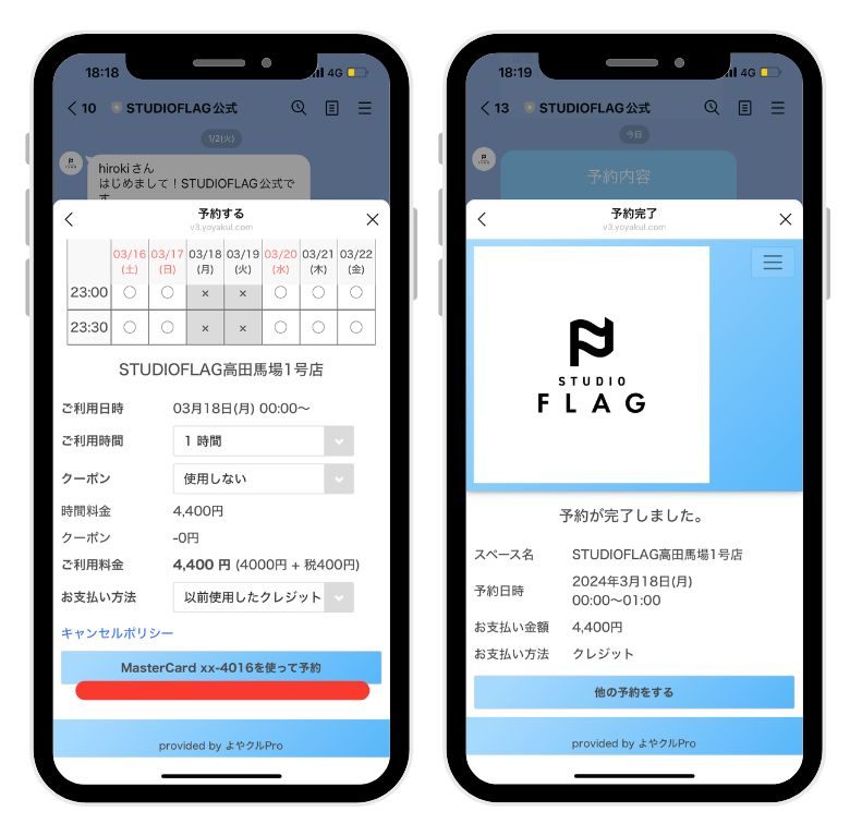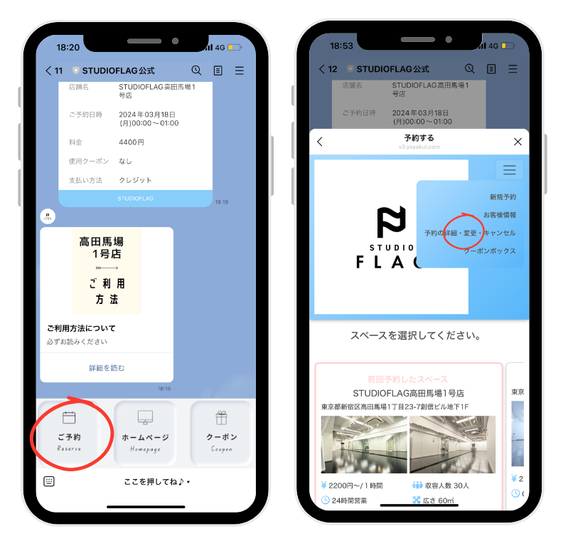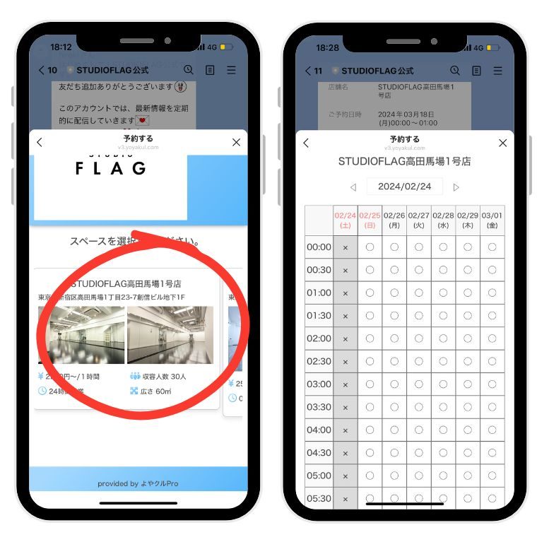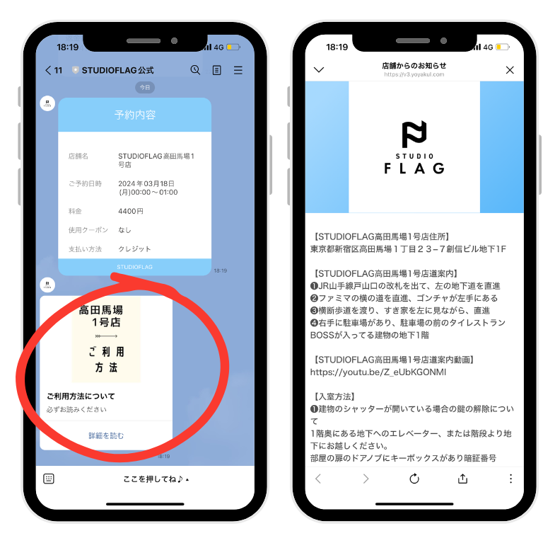 まず公式LINEの追加をお願いいたします。公式LINEにてご予約が完了しますと、ご利用方法(入室方法、アクセス、注意事項など)が表示されますので必ずご確認ください。