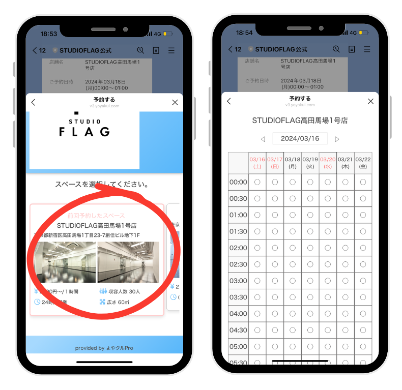 ②【スタジオ】を選択し、【日にち】、【時間】を選択。※○を選択